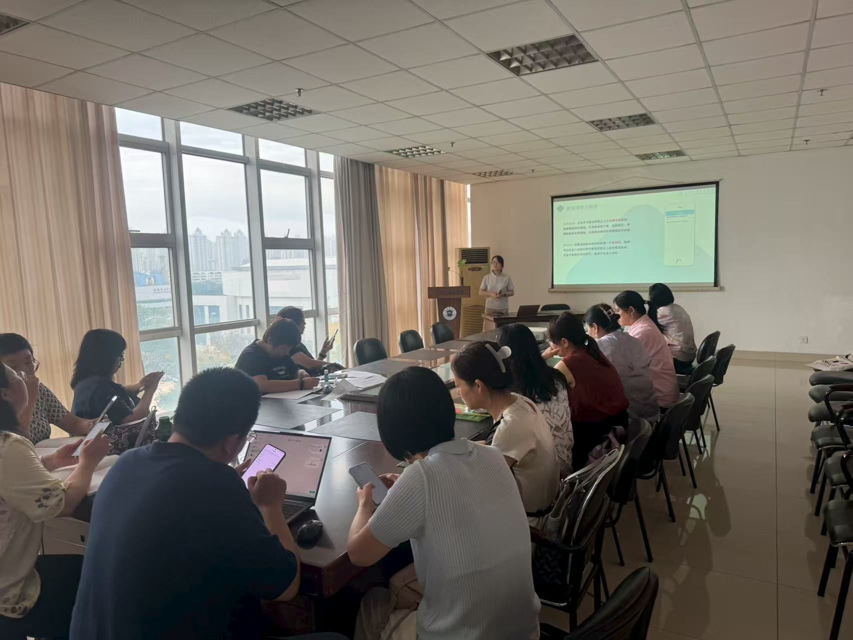 培训过程中,陈晓颖老师以“赋能外语课堂,提升教学效能”为核心,围绕 “WE Learn”教学软件展开详细解读。她结合外语教学中的实际场景,从软件的核心特点切入,重点介绍了 “师生互动模块”“个性化学情分析”“网络中的学习分析”等功能优势。随后通过PPT演示,清晰讲解了软件“教师端备课-学生端学习-数据端反馈”的运行模式。最后还针对课程类型,指导了软件在相关教学环节的实操方法,让在场教师直观掌握了软件与课堂教学的结合路径。
