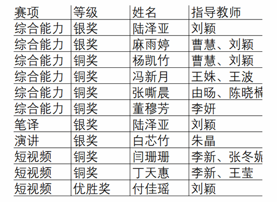 2025年10月25日,由辽宁省教育厅主办、外语教学与研究出版社协办的“外研社·国才杯”“理解当代中国”辽宁省外语能力大赛在辽宁省大学圆满落幕。我校学子在比赛中表现优异,凭借扎实的语言功底、对时代主题的深刻洞察以及富有创意的表达形式,在笔译、写作、短视频与演讲四大赛道中荣获11项大奖,其中银奖4项、铜奖6项、优胜奖1项。