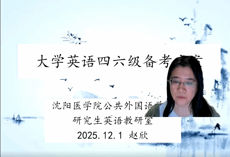 研究生英语教研室赵欣老师通过线上平台,为医养学院和医学信息学院的同学们带来了一场主题为“四六级高效备考策略”的专题讲座。讲座聚焦考试核心题型与提分技巧,助力考生在倒计时冲刺阶段构建科学复习方案,精准突破备考难点。